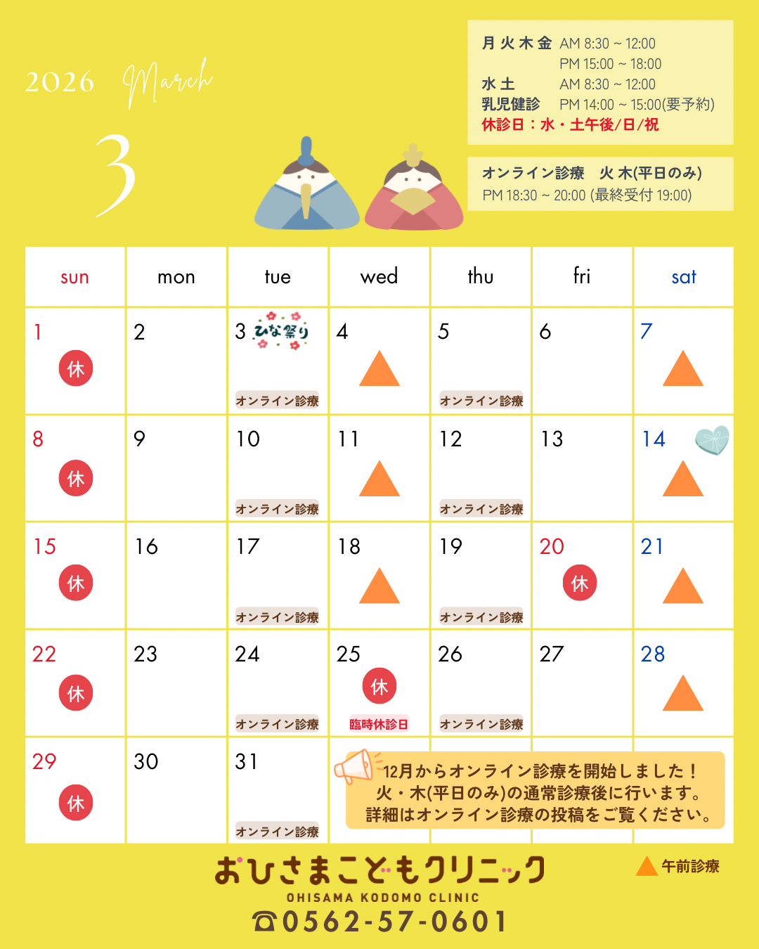 1/3(土)のオンライン診療は【臨時診療日】です🌿